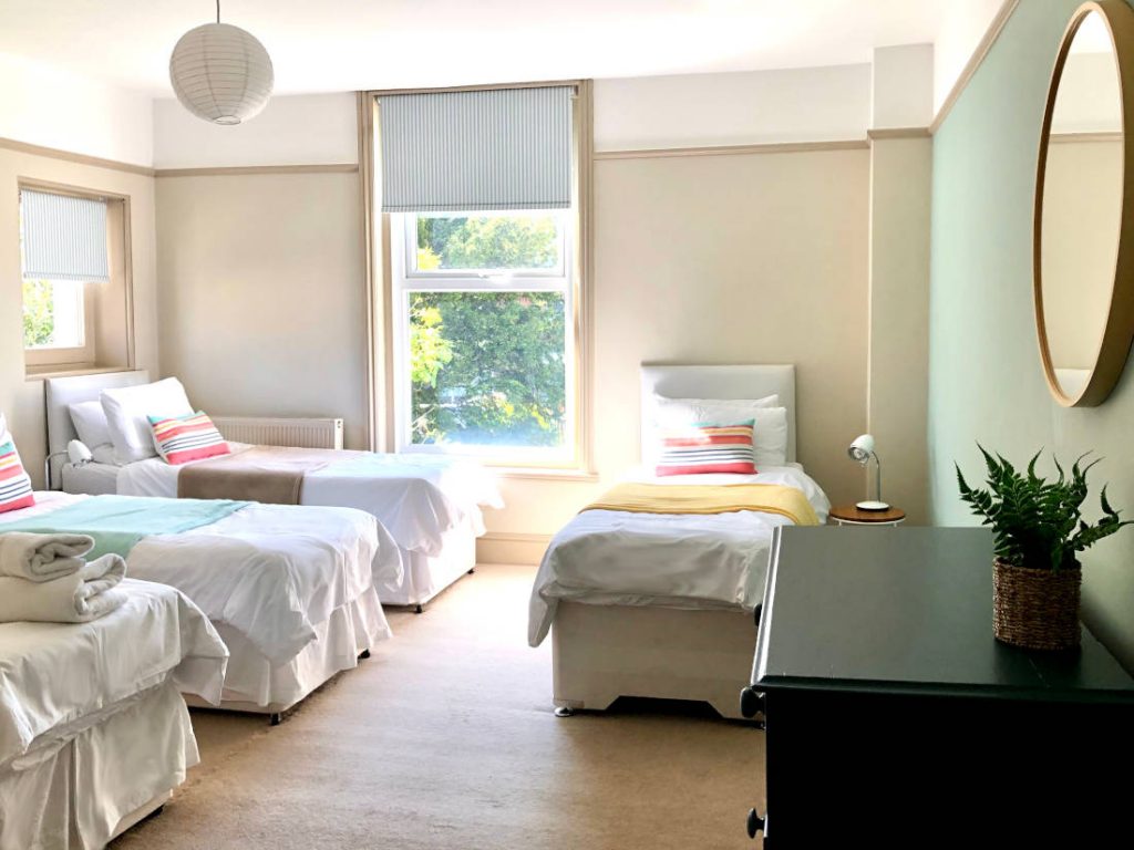 Bury Tower offers spacious accommodation for large groups (up to 18 guests) that live together as one household. Up to 17 can sleep in separate beds with optional sofa bed use. There is a large dining table and outdoor table and chairs, both seating 18, plus a large gas BBQ and off-road parking.